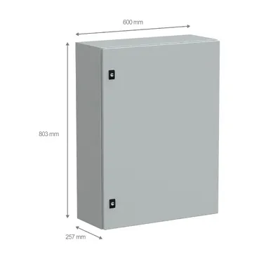 Spacial CRN steel wall-mounting enclosure for multi-purpose applications It is designed for use in harsh environments, withstanding high impact due to its IK10 (IEC62262) rating and high resistance to dust and water with an IP66 rating (IEC60529) This enclosure has a nominal height, width, and depth of 800mm, 600mm, and 250mm, respectively The enclosure is grey-coloured (RAL7035) with an epoxy-polyester powder surface finish The enclosure consists of a body, a cable gland plate, a plain door, and a lock The door can be opened up to 120°, allowing easy access to the equipment inside It is possible to change the opening side of the door (reversible) The door has a three-point lock with a 3mm double-bar insert The door and the cable gland plate can be removed for maintenance purposes The net weight of the enclosure is 20kg
