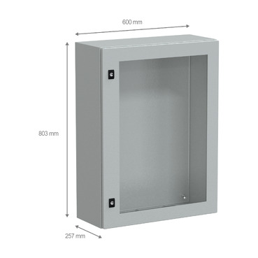 Spacial CRN steel wall-mounting enclosure for multi-purpose applications It is designed for use in harsh environments, withstanding high impact due to its IK08 (IEC62262) rating and high resistance to dust and water with an IP66 rating (IEC60529) This enclosure has a nominal height, width, and depth of 800mm, 600mm, and 250mm, respectively The enclosure is grey-coloured (RAL7035) with an epoxy-polyester powder surface finish The enclosure consists of a body, a cable gland plate, a glazed door, and a lock The door is made of steel and security glass, and can be opened up to 120°, allowing easy access to the equipment inside It is possible to change the opening side of the door (reversible) The door has a three-point lock with a 3mm double-bar insert The door and the cable gland plate can be removed for maintenance purposes The net weight of the enclosure is 18,916kg