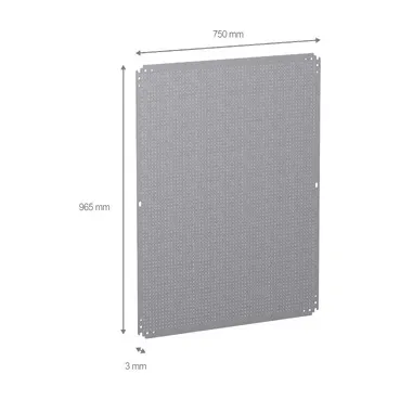 Microperforated mounting plate for Spacial CRN, S3D, S3X, PLM. For enclosures H is1000 x W is800 mm. With holes diam 3,6mm on 12,5mm pitch. Multi-purpose mounting access. Step slide mounting location or direct fixing on backstuds (M8 screws). 150 Kg permissible load. Galvanised steel.