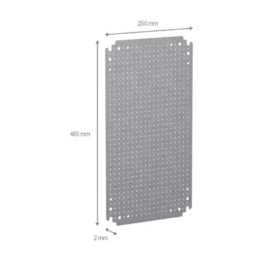 Microperforated mounting plate for Spacial CRN, S3D, S3X, PLM. For enclosures H is500 x W is300 mm. With holes diam 3,6mm on 12,5mm pitch. Multi-purpose mounting access. Step slide mounting location or direct fixing on backstuds (M8 screws). 60 Kg permissible load. Galvanised steel. Reversible dimensions is Can be installed in enclosure with inverted dimensions.