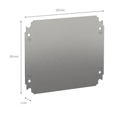 Plain mounting plate for Spacial CRN, S3D, S3X, PLM. For enclosures H is300 x W is250 mm. Multi-purpose mounting accessory. Step slide mounting location or direct fixing on backstuds (M8 screws). 60 Kg permissible load. Galvanised steel. Set of 1.
