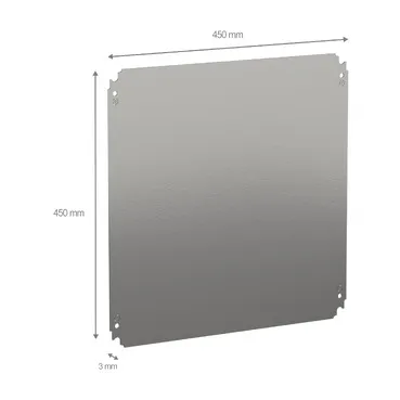Plain mounting plate for Spacial CRN, S3D, S3X, PLM. For enclosures H is500 x W is500 mm. Multi-purpose mounting accessory. Step slide mounting location or direct fixing on backstuds (M8 screws). 90 Kg permissible load. Galvanised steel. Set of 1.