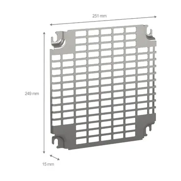 Monobloc perforated mounting plates with universal perforations for Spatial CRN, S3D, S3X and Thalassa PLM. The dimensions are (H) 300 mm x (W) 300 mm. The mounting plate can be fixed using step slide or by direct fixing on backstuds (M8 screws). It is Telequick perforated. The dimensions of the cut-out are 11 mm x 26 mm. It count a total of 144 slots. The product is made of steel with zinc coated surface finish. It can be installed in the rear of the enclosure. This product is qualified as a green premium, with minimal use of hazardous substances.