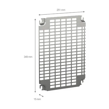 Monobloc perforated mounting plates with universal perforations for Spatial CRN, S3D, S3X and Thalassa PLM. The dimensions are (H) 400 mm x (W) 300 mm. The mounting plate can be fixed using step slide or by direct fixing on backstuds (M8 screws). It is Telequick perforated. The dimensions of the cut-out are 11 mm x 26 mm. It count a total of 198 slots. The product is made of steel with zinc coated surface finish. It can be installed in the rear of the enclosure. This product is qualified as a green premium, with minimal use of hazardous substances.