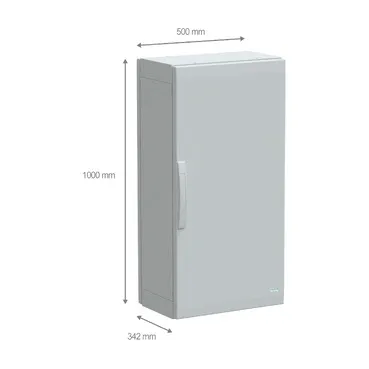 This PLA version of the Thalassa PLA is a multi-purpose, floor-standing enclosure that is suitable for various applications It has a nominal height of 1000mm, a width of 500mm, and a depth of 320mm, and is made of polyester reinforced with fiberglass This material provides the enclosure with durability and resistance to harsh environments, both indoor and outdoor The enclosure is available in grey (RAL 7035), and is composed of a sealed top and bottom part, assembled with side parts It features a single plain front door that can be opened up to 120° from either the right or left side, providing easy access to the equipment inside The door is secured with a four-point lock and a 5mm double-bar insert