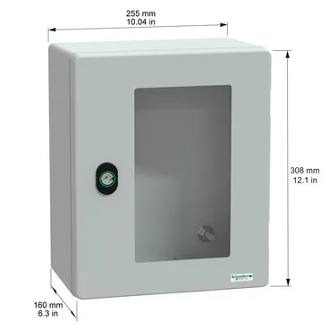 This PLM is a wall-mounted enclosure that is suitable for multi-purpose applications The enclosure has a nominal height, width, and depth of 308 mm, 255 mm, and 160 mm, respectively It is made of polyester reinforced with fibreglass for the body and tempered glass for the door, which offers durability and resistance to industrial and outdoor environments The enclosure comes in a grey (RAL 7035) color The enclosure consists of one body, one door, and one lock The door is transparent, allowing easy visibility of the equipment inside The door can be opened from the front and has a 3 mm double-bar lock