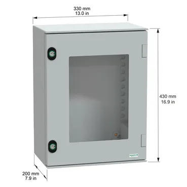 This PLM is a wall-mounted enclosure that is suitable for multi-purpose applications The enclosure has a nominal height, width, and depth of 430 mm, 330 mm, and 200 mm, respectively It is made of polyester reinforced with fibreglass for the body and tempered glass for the door, which offers durability and resistance to industrial and outdoor environments The enclosure comes in a grey (RAL 7035) color The enclosure consists of one body, one door, and two locks The door is transparent, allowing easy visibility of the equipment inside The door can be opened from the front and has two 3 mm double-bar locks