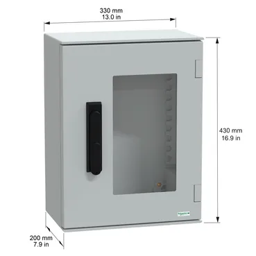 This PLM is a wall-mounted enclosure that is suitable for multi-purpose applications The enclosure has a nominal height, width, and depth of 430 mm, 330 mm, and 200 mm, respectively It is made of polyester reinforced with fibreglass for the body and tempered glass for the door, providing durability and resistance to industrial and outdoor environments The enclosure comes in a grey (RAL 7035) color The enclosure consists of one body, one door, and one handle lock The door is transparent, allowing easy visibility of the equipment inside The door can be opened from the front and has a 3 points lock and a handle with a 1242E key lock