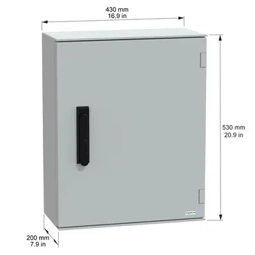 This PLM is a wall-mounted enclosure that is suitable for multi-purpose applications The enclosure has a nominal height, width, and depth of 530 mm, 430 mm, and 200 mm, respectively It is made of polyester reinforced with fibreglass, offering durability and resistance to industrial and outdoor environments The enclosure comes in a grey (RAL 7035) color The enclosure consists of one body, one door, and one handle lock The door is plain and can be opened from the front with a 3 points lock and handle with 1242E key lock The enclosure offers high protection against dust and water with an IP66 rating (IEC 60529)