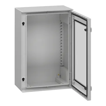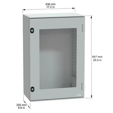 This PLM is a wall-mounted enclosure that is suitable for multi-purpose applications The enclosure has a nominal height, width, and depth of 647 mm, 436 mm, and 250 mm, respectively It is made of polyester reinforced with fibreglass for the body and tempered glass for the door, which offers durability and resistance to industrial and outdoor environments The enclosure comes in a grey (RAL 7035) color The enclosure consists of one body, one door, and two locks The door is transparent, allowing easy visibility of the equipment inside