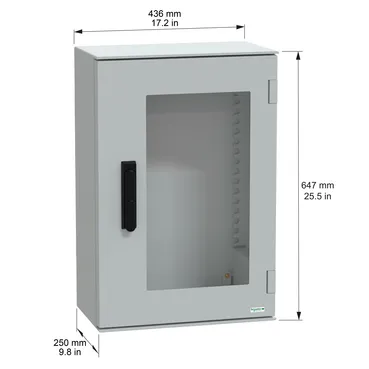 Thalassa PLM wall-mounting polyester enclosure monobloc w/glazed door. 647 x 436 x 250 mm. Built-in canopy, one piece moulded with notches in the rear. Without mounting plate. 2 locks (3 points lock, handle with 1242E key lock). Accessible front. Polyester reinforced with fibreglass, tempered glass door. Grey RAL 7035. IP66, IK08, NEMA (13,4X) 960°C fire resistance.