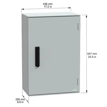 This PLM is a wall-mounted enclosure that is suitable for multi-purpose applications The enclosure has a nominal height, width, and depth of 647 mm, 436 mm, and 250 mm, respectively It is made of polyester reinforced with fibreglass, which offers durability and resistance to industrial and outdoor environments The enclosure comes in a grey (RAL 7035) color The enclosure consists of one body, one door, and one handle lock The door is plain and can be opened from the front with a 3 points lock and handle with 1242E key lock The enclosure offers high protection against dust and water with an IP66 rating (IEC 60529)