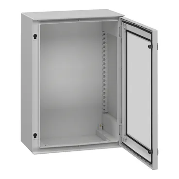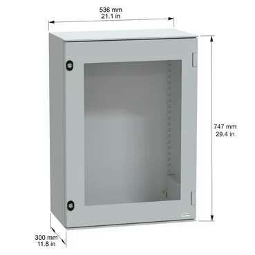 This PLM is a wall-mounted enclosure that is suitable for multi-purpose applications The enclosure has a nominal height, width, and depth of 747 mm, 536 mm, and 300 mm, respectively It is made of polyester reinforced with fibreglass for the body and tempered glass for the door, making it highly durable and resistant to industrial and outdoor environments The enclosure comes in a grey (RAL 7035) color The enclosure consists of one body, one door, and two locks The door is transparent, allowing easy visibility of the equipment inside The door can be opened from the front and has two 3 mm double-bar locks