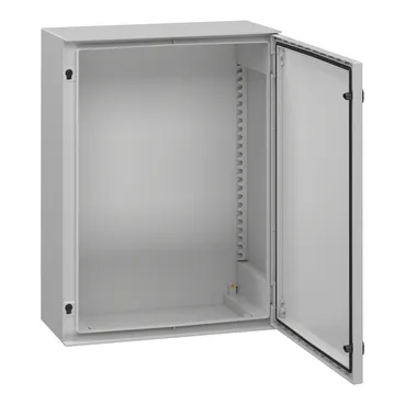 This PLM is a wall-mounted enclosure that is suitable for multi-purpose applications The enclosure has a nominal height, width, and depth of 847 mm, 636 mm, and 300 mm, respectively It is made of polyester reinforced with fibreglass, which offers durability and resistance to industrial and outdoor environments The enclosure comes in a grey (RAL 7035) color The enclosure consists of one body, one plain door, and two locks The door can be opened from the front and has two 3 mm double-bar locks for added security The enclosure offers high protection against dust and water with an IP66 rating (IEC 60529)