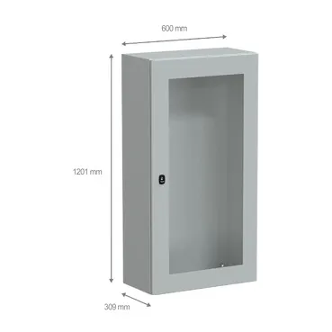 Spacial S3D steel wall-mounting enclosure for multi-purpose applications is designed for use in harsh environments It can withstand high impact due to its IK08 (IEC62262) rating and has a high resistance to dust, water and corrosion with an IP66 rating (IEC60529) and NEMA 4X/13 rating This enclosure has a nominal height, width and depth of 1200mm, 600mm and 300mm, respectively The enclosure is grey-coloured (RAL7035) with an epoxy-polyester powder surface finish The enclosure consists of a body, one glazed door, one lock and one cable gland plate The door can be opened up to 120°, allowing easy access to the equipment inside Furthermore, it is possible to change the opening side of the door (reversible) The door has a three-point lock with a 3mm double-bar insert The door and the cable gland plate can be removed for maintenance purposes