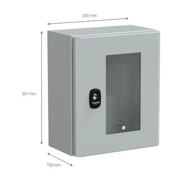 Spacial S3D steel wall-mounting enclosure for multi-purpose applications is designed for use in harsh environments It is certified by cUL, GL, BV, LR, UL and DNV and has a nominal height, width and depth of 300mm, 250mm and 150mm, respectively The enclosure is grey-coloured (RAL7035) with an epoxy-polyester powder surface finish It has a single piece body and a gutter-shaped front rail double sheet thickness for increased protection The enclosure consists of a body, one glazed door, one lock and one cable gland plate The doors can be opened up to 120°, allowing easy access to the equipment inside Furthermore, it is possible to change the opening side of the doors (reversible) The doors have a three-point lock with a 3mm double-bar insert The doors and the cable gland plate can be removed for maintenance purposes