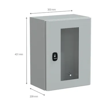 Spacial S3D steel wall-mounting enclosure for multi-purpose applications is designed for use in harsh environments It has a nominal height, width and depth of 400mm, 300mm and 200mm, respectively The enclosure is grey-coloured (RAL7035) with an epoxy-polyester powder surface finish The enclosure consists of a body, one glazed door, one cable gland plate and a lock The doors can be opened up to 120°, allowing easy access to the equipment inside Furthermore, it is possible to change the opening side of the doors (reversible) The doors have a three-point lock with a 3mm double-bar insert The doors and the cable gland plates can be removed for maintenance purposes The net weight of the enclosure is 5,804kg