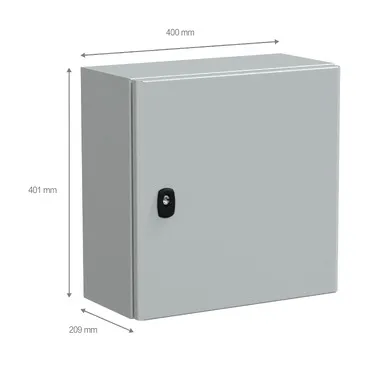 Spacial S3D steel wall-mounting enclosure for multi-purpose applications is designed for use in harsh environments It can withstand high impact due to its IK10 (IEC62262) rating and has a high resistance to dust and water with an IP66 rating (IEC60529) This enclosure has a nominal height, width and depth of 400mm, 400mm and 200mm, respectively The enclosure is grey-coloured (RAL7035) with an epoxy-polyester powder surface finish The enclosure consists of a body, one cable gland plate, one plain door with a lock, and a galvanised steel mounting plate The door can be opened up to 120°, allowing easy access to the equipment inside