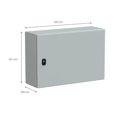 Spacial S3D is a monobloc wall-mounting enclosure for multi-purpose applications It is certified by cUL, BV, GL, UL, LR and DNV and is designed for use in harsh environments The enclosure has a nominal height, width and depth of 400mm, 600mm and 200mm, respectively It is made of steel and is grey-coloured (RAL7035) with an epoxy-polyester powder surface finish The enclosure consists of a body, one door, one lock and one cable gland plate The door can be opened up to 120°, allowing easy access to the equipment inside It is also possible to change the opening side of the door (reversible) The door has a three-point lock with a 3mm double-bar insert The door and the cable gland plate can be removed for maintenance purposes