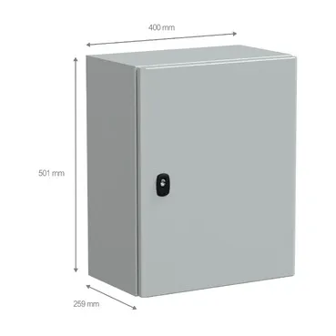 Spacial S3D steel wall-mounting enclosure is designed for multi-purpose applications It is suitable for use in harsh environments, as it has a high impact resistance with an IK10 rating (IEC62262) and a high dust and water resistance with an IP66 rating (IEC60529) The enclosure has a nominal height, width and depth of 500mm, 400mm and 250mm, respectively It is grey-coloured (RAL7035) with an epoxy-polyester powder surface finish The enclosure consists of a body, one door, one lock and one cable gland plate The door can be opened up to 120°, allowing easy access to the equipment inside Furthermore, it is possible to change the opening side of the door (reversible) The door has a three-point lock with a 3mm double-bar insert The door and the cable gland plate can be removed for maintenance purposes The net weight of the enclosure is 10,2kg