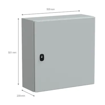 Spacial S3D steel wall-mounting enclosure for multi-purpose applications is designed for use in harsh environments It can withstand high impact due to its IK10 (IEC62262) rating and has a high resistance to dust and water with an IP66 rating (IEC60529) This enclosure has a nominal height, width and depth of 500mm, 500mm and 200mm, respectively The enclosure is grey-coloured (RAL7035) with an epoxy-polyester powder surface finish The enclosure consists of a body, a mounting plate, a plain door with a lock and a cable gland plate The door can be opened up to 120°, allowing easy access to the equipment inside