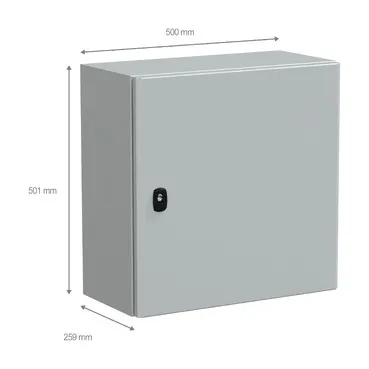 Spacial S3D is a multi-purpose wall-mounting enclosure made from steel and galvanised steel It is designed for use in harsh environments and is certified by UL, cUL, LR, BV, GL, and DNV The enclosure has a nominal height, width and depth of 500mm, 500mm and 250mm, respectively The enclosure is grey-coloured (RAL7035) with an epoxy-polyester powder surface finish The enclosure consists of a body, a mounting plate, a plain door with a lock and a cable gland plate The door can be opened up to 120°, allowing easy access to the equipment inside