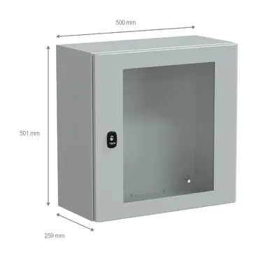 Spacial S3D steel wall-mounting enclosure for multi-purpose applications is designed for use in harsh environments It can withstand high impact due to its IK08 (IEC62262) rating and has a high resistance to dust, water and corrosive elements with an IP66 rating (IEC60529) and NEMA 4X/13 rating This enclosure has a nominal height, width and depth of 500mm, 500mm and 250mm, respectively The enclosure is grey-coloured (RAL7035) with an epoxy-polyester powder surface finish The enclosure consists of a body, one glazed door, one lock and one cable gland plate The door can be opened up to 120°, allowing easy access to the equipment inside Furthermore, it is possible to change the opening side of the door (reversible) The door has a three-point lock with a 3mm double-bar insert The door and the cable gland plate can be removed for maintenance purposes