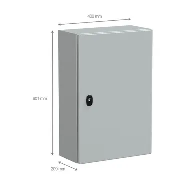 Spacial S3D steel wall-mounting enclosure is designed for multi-purpose applications It is certified by LR, GL, UL, cUL, DNV and BV, providing assurance of its quality The enclosure has a nominal height, width and depth of 600mm, 400mm and 200mm, respectively It is grey-coloured (RAL7035) with an epoxy-polyester powder surface finish The enclosure consists of a body, a mounting plate, one plain door with a lock and a cable gland plate The door can be opened up to 120°, allowing easy access to the equipment inside Furthermore, it is possible to change the opening side of the door (reversible) The door has a three-point lock with a 3mm double-bar insert The door and the cable gland plate can be removed for maintenance purposes, while the mounting plate can be removed by fixing element The net weight of the enclosure is 13kg