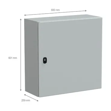 Spacial S3D steel wall-mounting enclosure for multi-purpose applications is designed for use in harsh environments It can withstand high impact due to its IK10 (IEC62262) rating and has a high resistance to dust and water with an IP66 rating (IEC60529) This enclosure has a nominal height, width and depth of 600mm, 600mm and 250mm, respectively The enclosure is grey-coloured (RAL7035) with an epoxy-polyester powder surface finish The enclosure consists of a body, one cable gland plate, one plain door with a lock, and a galvanised steel mounting plate The door can be opened up to 120°, allowing easy access to the equipment inside