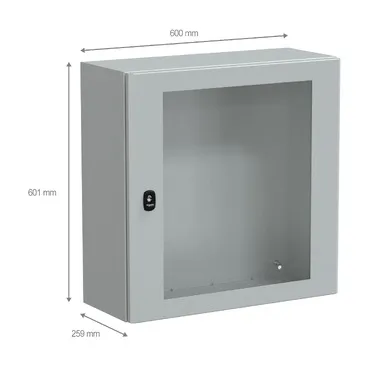Spacial S3D is a multi-purpose steel wall-mounting enclosure designed for use in harsh environments It is certified by GL, BV, DNV, LR, UL, and cUL and meets IEC 62208 standards This enclosure has a nominal height, width and depth of 600mm, 600mm and 250mm, respectively The enclosure is grey-coloured (RAL7035) with an epoxy-polyester powder surface finish The enclosure consists of a body, a glazed door, a lock, and a cable gland plate The doors can be opened up to 120°, allowing easy access to the equipment inside Furthermore, it is possible to change the opening side of the doors (reversible)