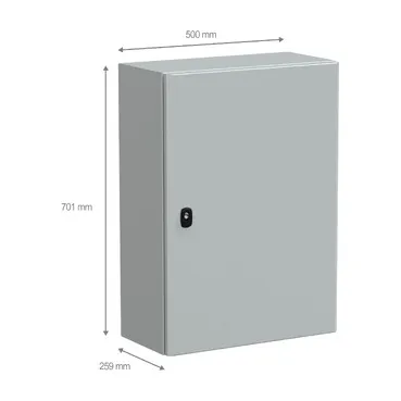 Spacial S3D wall-mounting enclosure is a multi-purpose enclosure made of steel and designed for use in harsh environments It is certified by BV, UL, DNV, cUL, GL, and LR standards and is grey-coloured (RAL 7035) with an epoxy-polyester powder surface finish The enclosure has a nominal height, width, and depth of 700mm, 500mm and 250mm, respectively The enclosure consists of a body, one door, one lock, and one cable gland plate The door can be opened up to 120°, allowing easy access to the equipment inside Furthermore, it is possible to change the opening side of the door (reversible) The door has a three-point lock with a 3mm double-bar insert The door and the cable gland plate can be removed for maintenance purposes The net weight of the enclosure is 15kg