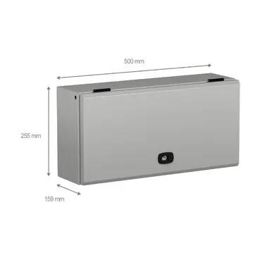 Spacial S3DB compact enclosure. H is250xW is500xD is150 mm. For equipping with terminal. No mounting plate or cable gland included. 1 front face/door. Wall mounting install (Horz/Vert). Gutter-shaped front rail double sheet thickness particularity. Steel made, epoxy-polyester powder finish. Protection IP 66, IK10, Grey RAL 7035. Certifications is BV, CUL, DNV, GL, LR, UL.