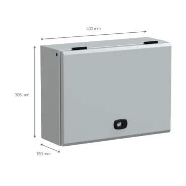 Spacial S3DB is a steel wall-mounting enclosure for a terminal application It has a nominal height, width and depth of 300mm, 400mm and 150mm respectively and a net weight of 4,748kg The enclosure is grey (RAL 7035) with an epoxy-polyester powder surface finish, and has a single piece body with a plain door and a 3mm double-bar lock The door is reversible and can be opened up to 180°, providing easy access to the equipment inside The enclosure is certified by BV, GL, DNV, LR, cUL and UL, and complies with IEC 62208, NEMA 4X/13, IK10 (IEC 62262) and IP66 (IEC 60529) standards It has a gutter-shaped front rail double sheet thickness for increased durability and the door and body can be removed for maintenance purposes Certifications is BV, CUL, DNV, GL, LR, UL.