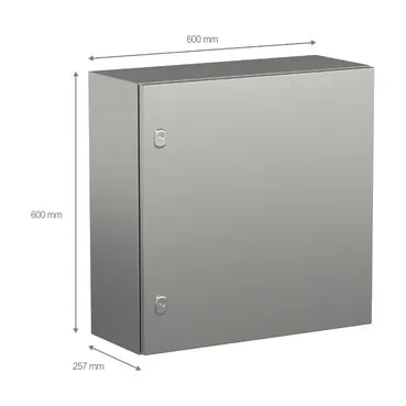 Spacial S3X stainless steel 316L wall-mounting enclosure for a multi-purpose application and resistance to corrosion It is designed for use in harsh environments, it can withstand high impact due its IK10 (IEC62262) and it has a high resistance to dust and water with an IP66 rating (IEC60529) This enclosure has a nominal height, width and depth of 600mm, 600mm and 250mm respectively The enclosure is made with Scotch-Brite® brushed surface finish The enclosure consists of a body, a plain door, two locks and two perforated vertical profiles The door can be opened up to 120°, allowing easy access to the equipment inside It is possible to change the opening side of the door (reversible)