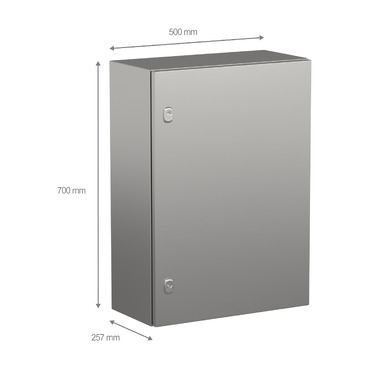 Spacial S3X stainless steel 304L wall-mounting enclosure for a multi-purpose application and resistance to corrosion It is designed for use in harsh environments, it can withstand high impact due its IK10 (IEC62262) and it has a high resistance to dust and water with an IP66 rating (IEC60529) This enclosure has a nominal height, width and depth of 700mm, 500mm and 250mm respectively The enclosure is made with Scotch-Brite® brushed surface finish The enclosure consists of a body, a plain door and two locks The door can be opened up to 120°, allowing easy access to the equipment inside It is possible to change the opening side of the door (reversible) The door has a two lock points lock with a 3mm double-bar insert The door can be removed for maintenance purposes The net weight of the enclosure is 17,36kg