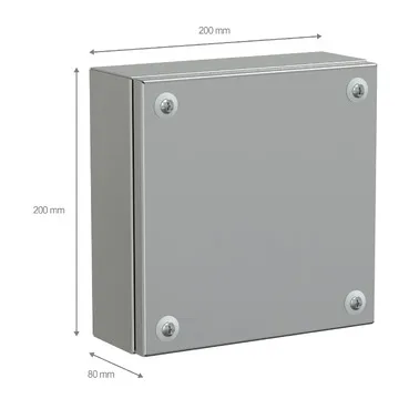 Spacial SBX is a stainless steel 304L industrial box designed for a multi-purpose application It is designed to withstand harsh environments with its IK10 (IEC62262) and IP66 (IEC60529) ratings It has a nominal height, width and depth of 200mm, 200mm and 80mm respectively It is made with a Scotch-Brite® brushed surface finish and consists of 4 cover screw, a cover and a body It has a captive screw PZ2 outside the sealed area and its cover can be removed for maintenance purposes The box meets the IEC 62208 standards and has an ambient air temperature range for storage and operation of -35-60 °C and -35-80 °C respectively To be used with a mounting plate or a DIN rail. Directly wall mounted o by fixing lugs (to be ordered separately). The enclosure meets the directives IEC 62208 and UL508A, certified by BV and UL respectively. Also compliant with marine requirements of BV Marine Division. This device is qualified as a green premium product, with minimal use of harzardous substances.