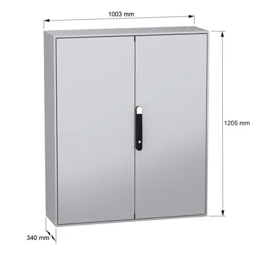 Spacial SM is a multi-purpose steel compact floor-standing enclosure designed for use in harsh environments It is certified by DNV, BV and UL and has a nominal height, width and depth of 1200mm, 1000mm and 300mm respectively The enclosure is made in grey color (RAL7035) with an epoxy-polyester powder surface finish and the handle is made in black color (RAL9005) It consists of a body, two plain doors, one cable gland plate, four mounting plate brackets, a blocking system on left door and a locking system with handle on the door The doors can be opened up to 120°, allowing easy access to the equipment inside The enclosure has a four-point lock with a handle with 5mm double-bar insert The doors and the mounting plate brackets can be removed for maintenance purposes