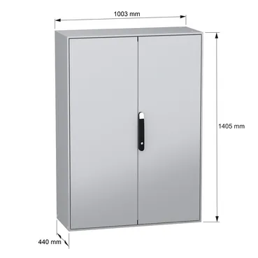 Spacial SM steel compact floor-standing enclosure is designed for multi-purpose applications in harsh environments It has a nominal height, width and depth of 1400mm, 1000mm and 400mm respectively The enclosure is made of sheet steel and the doors and hinge are made of zamak It is certified by DNV, UL and BV and has an IK10 rating (IEC62262) and an IP55 rating (IEC60529) The enclosure is grey (RAL7035) in color with an epoxy-polyester powder surface finish and the handle is black (RAL9005) It has a single-piece body with a welded rear panel and a front part forming a rigid frame with welded corners It consists of two plain doors, one cable gland plate, four mounting plate brackets, a blocking system on left door and a locking system with handle on the door