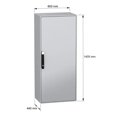 Spacial SM monobloc compact steel enclosure with plain front door. 1400 x 600 x 400 mm. Back panel welded, without mounting plate. 4 point door locking system with handle DB 5mm. Sheet steel. Protecti…