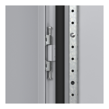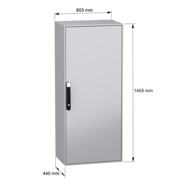 Spacial SM is a multi-purpose steel compact floor-standing enclosure designed for use in harsh environments It has a nominal height, width, and depth of 1400mm, 600mm, and 400mm respectively and is made in grey color (RAL7035) with an epoxy-polyester powder surface finish The handle is made in black color (RAL9005) The enclosure is certified by DNV, UL, and BV and is IK10 (IEC62262) and IP55 (IEC60529) rated for high impact and dust/water resistance, respectively It consists of a body, one cable gland plate, one plain door, four mounting plate brackets, one mounting plate and a locking system with handle on the door The door can be opened up to 120°, allowing easy access to the equipment inside The enclosure has a four-point lock with a handle with 5mm double-bar insert