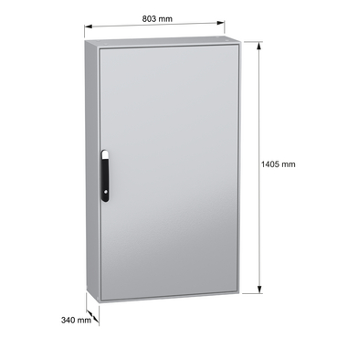 Spacial SM is a steel compact floor-standing enclosure for a multi-purpose application It is designed for use in harsh environments, it can withstand high impact due to its IK10 rating (IEC62262) and it has a high resistance to dust and water with an IP55 rating (IEC60529) This enclosure has a nominal height, width and depth of 1400mm, 800mm and 300mm respectively The enclosure is made in grey color (RAL7035) with an epoxy-polyester powder surface finish and the handle is made in black color (RAL9005) The enclosure consists of a body, one cable gland plate, one plain door, four mounting plate brackets and a locking system with handle on the door The door can be opened up to 120°, allowing easy access to the equipment inside The enclosure has a four-point lock with a handle with 5mm double-bar insert