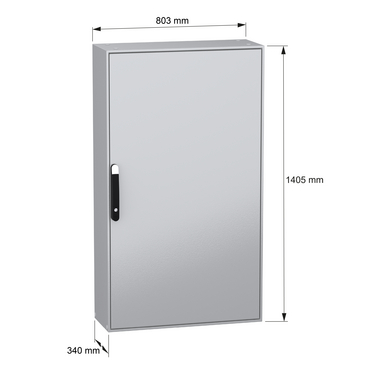 Spacial SM is a multi-purpose steel compact floor-standing enclosure designed for use in harsh environments It has a nominal height, width and depth of 1400mm, 800mm and 300mm respectively It is made of galvanised steel for the mounting plate, sheet steel for the body and door, and zamak for the hinge It has a grey color (RAL7035) with an epoxy-polyester powder surface finish and the handle is made in black color (RAL9005) The enclosure consists of a body, one cable gland plate, four mounting plate brackets, one mounting plate, one door and a locking system with handle on the door The door can be opened up to 120°, allowing easy access to the equipment inside The enclosure has a four-point lock with a handle with 5mm double-bar insert