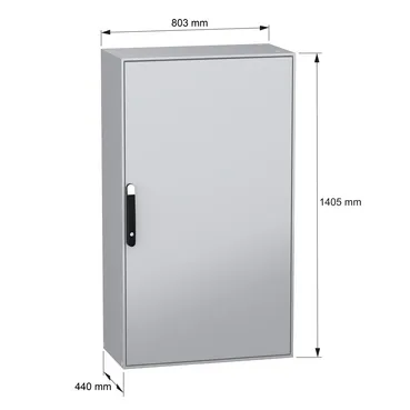 Spacial SM is a steel compact floor-standing enclosure for multi-purpose applications It is designed for use in harsh environments, it can withstand high impact due its IK10 (IEC62262) and it has a high resistance to dust and water with an IP55 rating (IEC60529) This enclosure has a nominal height, width and depth of 1400mm, 800mm and 400mm respectively The enclosure is made in grey color (RAL7035) with an epoxy-polyester powder surface finish and the handle is made in black color (RAL9005) The enclosure consists of a body, one cable gland plate, four mounting plate brackets, one plain door and a locking system with handle on the door The door can be opened up to 120°, allowing easy access to the equipment inside The enclosure has a four-point lock with a handle with 5mm double-bar insert