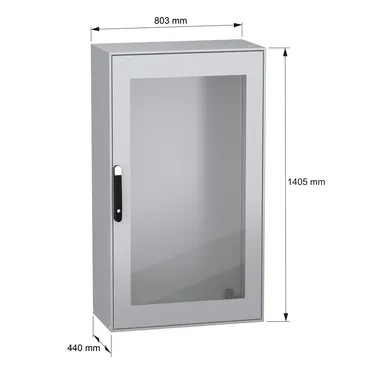 Spacial SM monobloc compact steel enclosure with glazed front door. 1400 x 800 x 400 mm. Back panel welded, without mounting plate. 4 point door locking system with handle DB 5mm. Sheet steel. Protection IP 55, IK08, Grey RAL 7035. 4 mounting plate support brackets included.