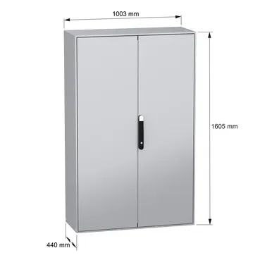 Spacial SM steel compact floor-standing enclosure is designed for multi-purpose applications in harsh environments With an IK10 rating (IEC62262) and an IP55 rating (IEC60529), it is resistant to high impact and dust and water This enclosure has a nominal height, width and depth of 1600mm, 1000mm and 400mm respectively The enclosure is made in grey color (RAL7035) with an epoxy-polyester powder surface finish and the handle is made in black color (RAL9005) The enclosure consists of a body, one cable gland plate, two plain doors, four mounting plate brackets, a blocking system on the left door and a locking system with handle on the door The doors can be opened up to 120°, allowing easy access to the equipment inside The enclosure has a four-point lock with a handle with 5mm double-bar insert