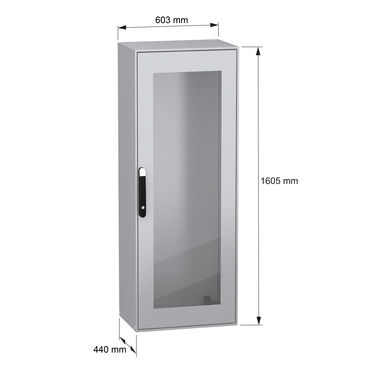 Spacial SM monobloc compact steel enclosure with glazed door. 1600 x 600 x 400 mm. Back panel welded, without mounting plate. 4 point door locking system with handle DB 5mm. Steel made. Protection IP 55, IK08, Grey RAL 7035. 4 mounting plate support brackets included.