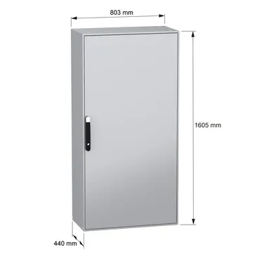 Spacial SM is a steel compact floor-standing enclosure designed for multi-purpose applications It is certified by DNV, UL and BV and is designed to withstand tough environments, with its IK10 (IEC62262) resistance to high impact and its IP55 rating (IEC60529) for dust and water resistance It has a nominal height, width and depth of 1600mm, 800mm and 400mm respectively The enclosure is made in grey color (RAL7035) with an epoxy-polyester powder surface finish and the handle is made in black color (RAL9005) The enclosure consists of a body, a cable gland plate, four mounting plate brackets, a reversible door with a four-point lock and a handle with 5mm double-bar insert The door and the mounting plate brackets can be removed for maintenance purposes The net weight of the enclosure is 76,5kg