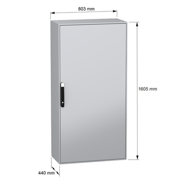 Spacial SM steel compact floor-standing enclosure is designed for multi-purpose applications It is certified by BV, DNV and UL, and it is designed for use in harsh environments, withstanding high impact due its IK10 rating (IEC62262) and having a high resistance to dust and water with an IP55 rating (IEC60529) This enclosure has a nominal height, width and depth of 1600mm, 800mm and 400mm respectively The enclosure is made in grey color (RAL7035) with an epoxy-polyester powder surface finish and the handle is made in black color (RAL9005) The enclosure consists of a body, a cable gland plate, a mounting plate, four mounting plate brackets, a reversible door and a locking system with handle on the door The door can be opened up to 120°, allowing easy access to the equipment inside The enclosure has a four-point lock with a handle with 5mm double-bar insert