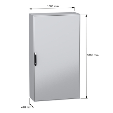 Spacial SM steel compact floor-standing enclosure for a multi-purpose application It is designed for use in harsh environments, it can withstand high impact due its IK10 (IEC62262) and it has a high resistance to dust and water with an IP55 rating (IEC60529) This enclosure has a nominal height, width and depth of 1800mm, 1000mm and 400mm respectively The enclosure is made in grey color (RAL7035) with an epoxy-polyester powder surface finish and the handle is made in black color (RAL9005) The enclosure consists of a body, one cable gland plate, one plain door, four mounting plate brackets, a locking system with handle on the door The door can be opened up to 120°, allowing easy access to the equipment inside The enclosure has a four-point lock with a handle with 5mm double-bar insert