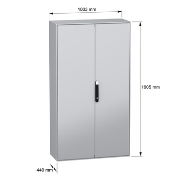 Spacial SM steel compact floor-standing enclosure is designed for a multi-purpose application It is designed to withstand harsh environments and can withstand high impacts with its IK10 (IEC62262) rating and has a high resistance to dust and water with an IP55 rating (IEC60529) This enclosure has a nominal height, width and depth of 1800mm, 1000mm and 400mm respectively The enclosure is made in grey color (RAL7035) with an epoxy-polyester powder surface finish and the handle is made in black color (RAL9005) The enclosure consists of a body, one cable gland plate, two plain doors, four mounting plate brackets, a blocking system on left door and a locking system with handle on the door The doors can be opened up to 120°, allowing easy access to the equipment inside The enclosure has a four-point lock with a handle with 5mm double-bar insert